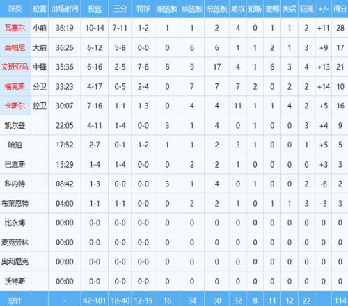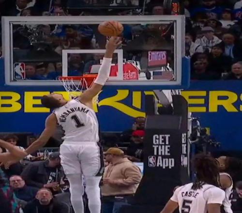 文班亚马(23届状元)防守端影响力巨大,屡次让21届状元坎宁安吃瘪,后者全场出手26次仅中5球得到16分6板10助2断3帽,正负值-18全队最低。