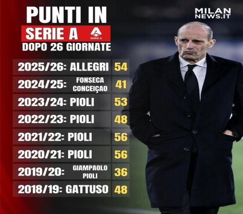北京时间2月24日,米兰新闻网统计出了AC米兰近8个赛季意甲前26轮过后的成绩,本赛季阿莱格里率队拿到54分为近8...