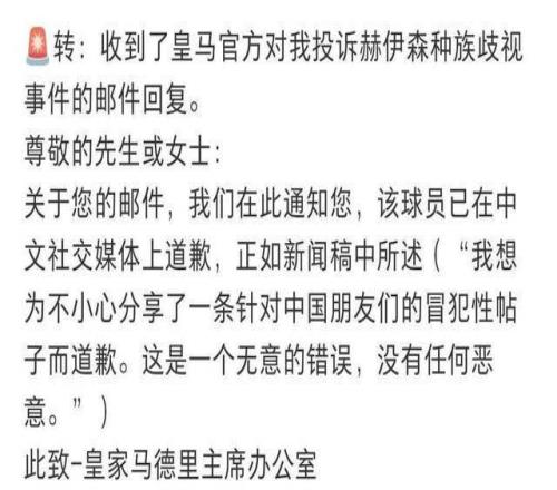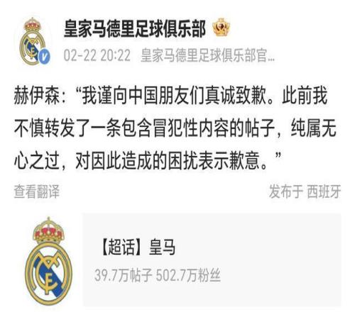 反观这次赫伊森的争议,球员转发争议内容,被发现后只以误触试图搪塞,俱乐部的态度尽显敷衍,所谓的道歉竟仅限于官方微博超话
