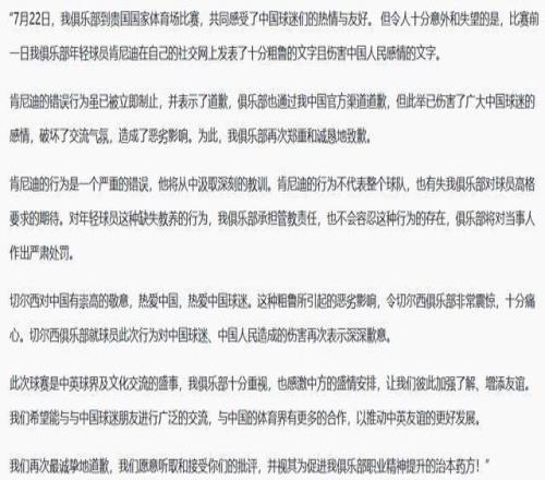 「切尔西对中国有崇高的敬意,热爱中国,热爱中国球迷。这种粗鲁所引起的恶劣影响,令切尔西俱乐部非常震惊,十分痛心。切尔西俱乐部就球员此次行为对中国球迷、中国人民造成的伤害再次表示深深歉意。」