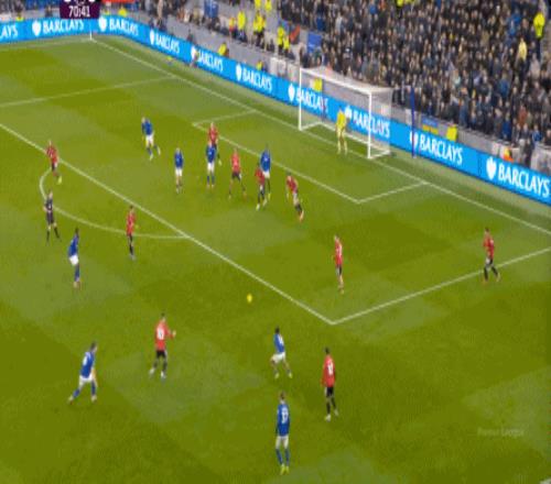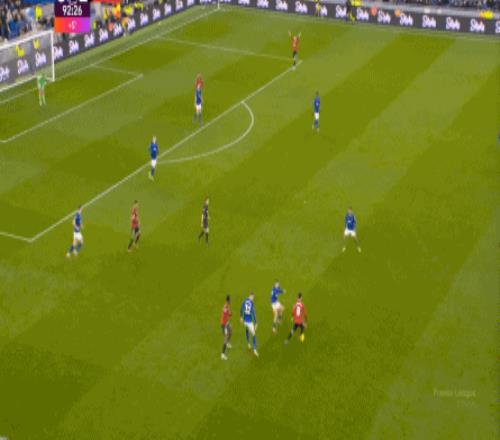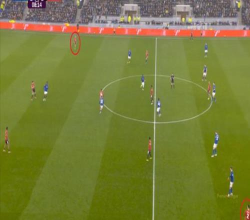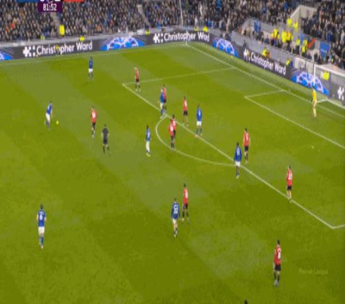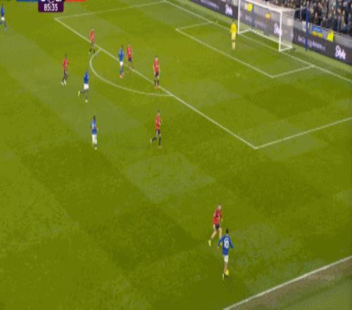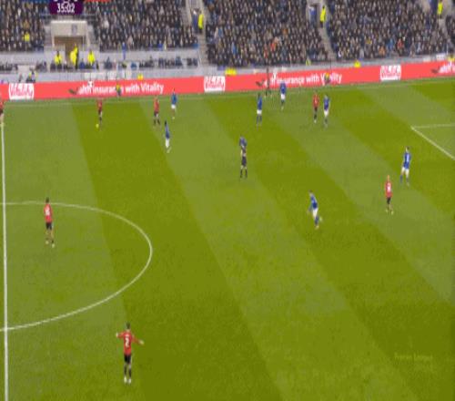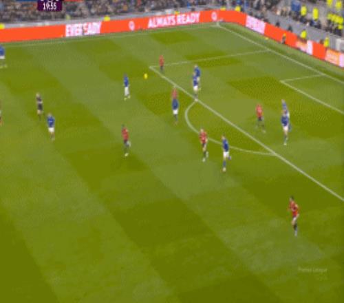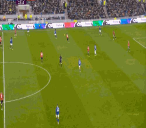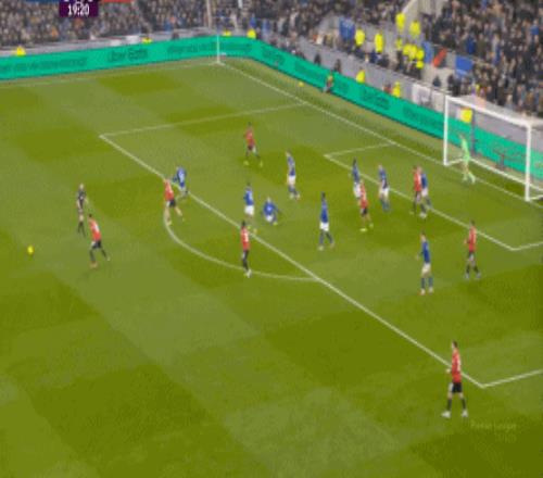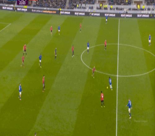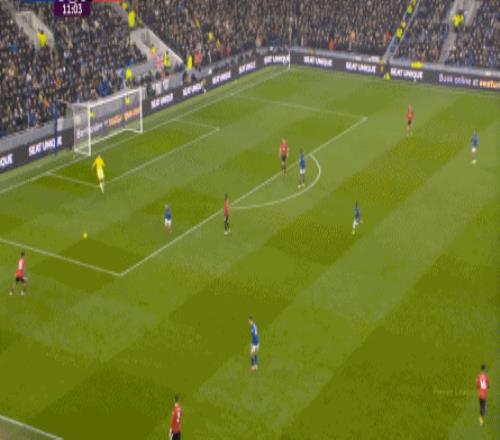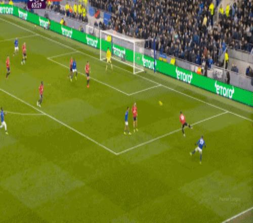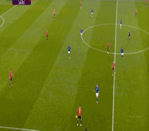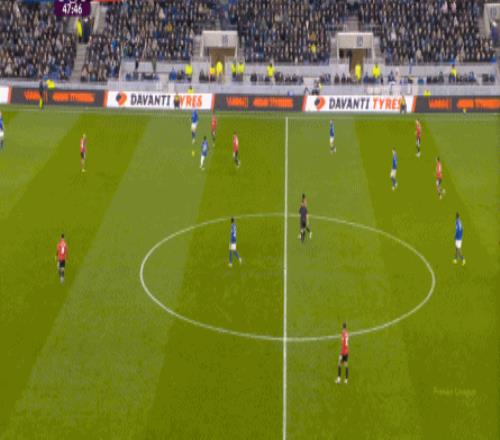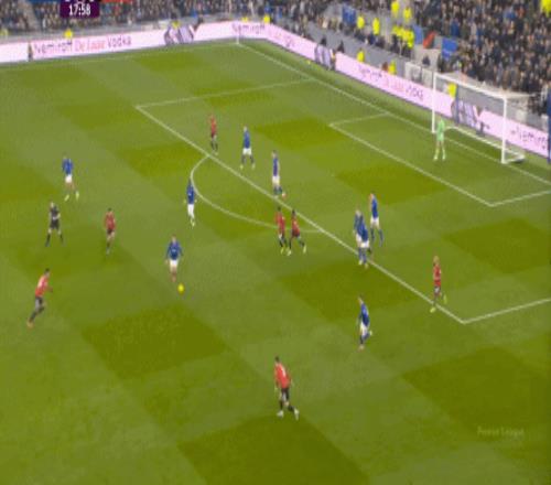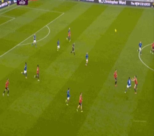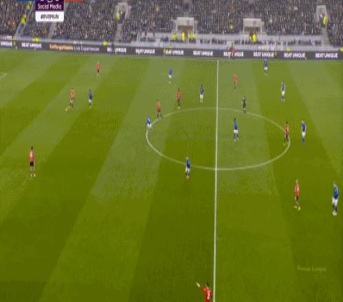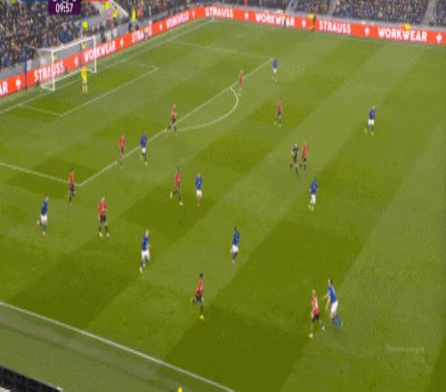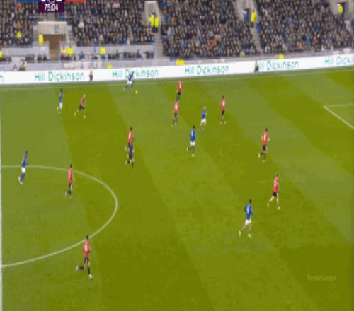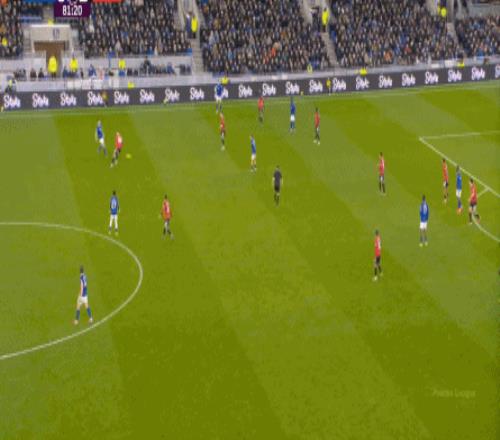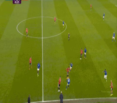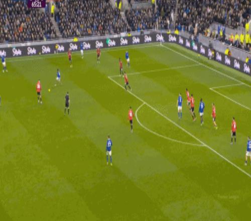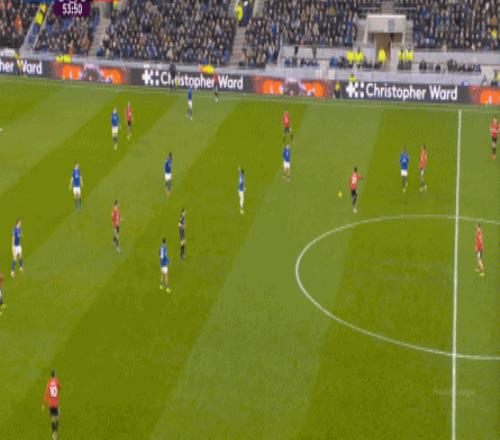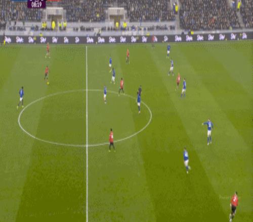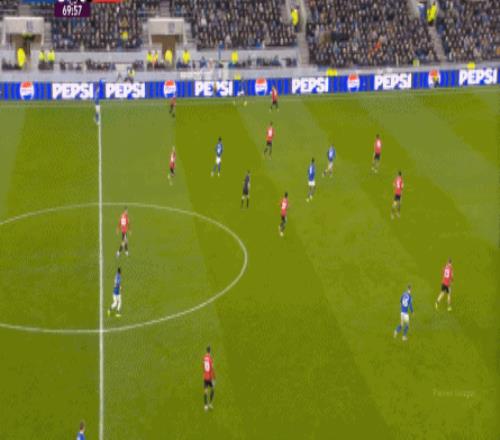因为,从55到70分钟,埃弗顿几乎将曼联压在了半场范围内,他们用相当长线条的方式来发展自己的进攻:
